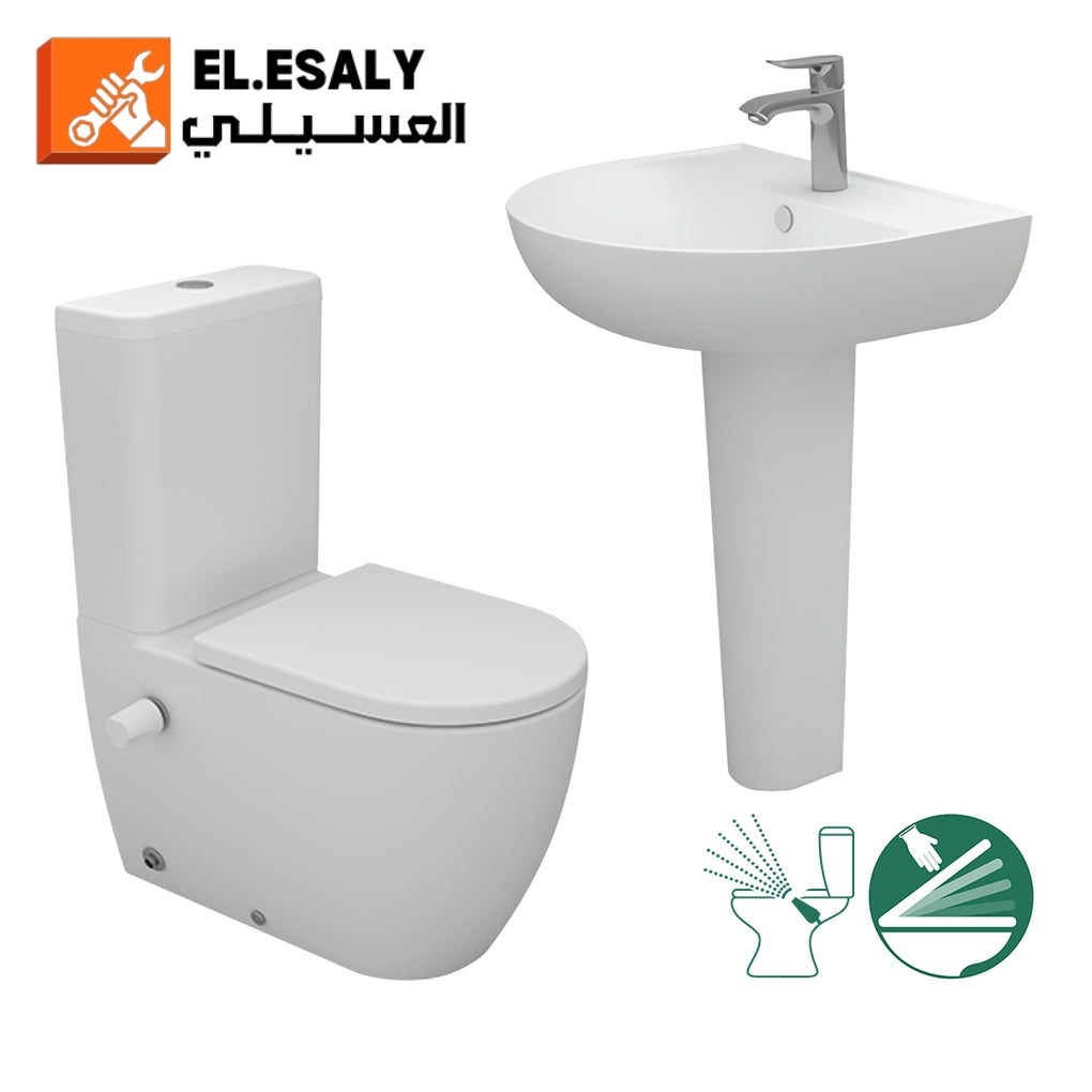طقم حمام تايتن مرحاض ملاصق كامل بالخزان والسديلى العادى و حوض 70 سم عامود طويل من سانى بيور
